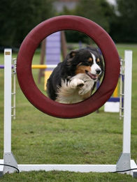 This is a team event, where dogs race over a number of hurdles, in order to retrieve a ball. Many Aussies have enjoyed competing as parts of Flyball teams thoughout the UK. This is often a fast and furious event that the dogs very much enjoy. For more information on Flyball please look at the British Flyball Association or the UK Flyball League websites.